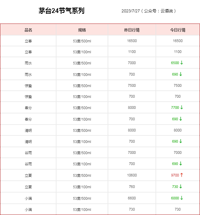 首頁酒業資訊白酒 白酒 茅臺 24節氣酒價格持續下跌中 未知 2023-07-27 10:16 白酒 茅臺 24節氣酒價格持續下跌中,普跌,除個別酒水沒下跌,其他品種500ml下跌500到1000 附近 小100ml酒也基本下跌! 茅臺 24節氣酒價格持續下跌中,普跌,除個別酒水沒下跌,其他品種500ml下跌500到1000 附近 小100ml酒也基本下跌! 上一篇2023-07-27日茅臺小滿53.00度酒的價格持續下跌今天(2023-07-27)茅臺小滿酒的價格為6,000一瓶,昨日價格為6,600一瓶,相對昨天價格波動為下跌 600元 。茅臺小滿酒容量為500ml,酒精度數為53.00度。 茅臺酒除了年份因素之外,還會受到市場供 上一篇中華酒牽手EMDC發展合作北京論壇,邀世界品中華7月25日,由新華通訊社聯合北京市 人民 政府 、 中國 人民 對外友好 協會 共同主辦的新興市場 國家 和發展 中國 家(EMDC)發展合作北京論壇在京舉辦。來自全球數十個 國家 的300余名政界、 相關文章 中華酒牽手EMDC發展合作北京論壇,邀世界品中華 2023-07-27日茅臺小滿53.00度酒的價格持續下跌 中國酒類流通協會王新國:酒行業要把握好文化建設及價值體系創新 “動銷”決勝!白金酒交出2023上半年成績單 總價近6億,復興系再賣金徽酒股權,千億級大基金“接盤” 2023-07-26日珍酒珍三十53度酒的價格下跌10元 江南小鎮“以白酒為興” 新老鄉賢抱團釀造“共富酒” 九里春白酒丨一瓶醉人的詩意,品味白酒濃香之旅 西鳳酒董事長張正:以酒為媒文化搭橋持續深化國際合作 上新“活力虎”,凈土阿壩白酒釋放戰略強音