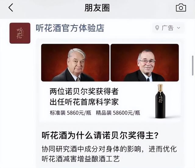 不少消費者反饋稱,近日北京大量居民樓電梯廣告內出現了聽花酒的身影,在其廣告內容上,更將“聽花酒為什么那么貴?”作為主要宣傳內容,同時廣告畫面上兩位諾貝爾獎獲得者的頭像也吸引著大量消費者的目光。記者在青海春天官網上看到,該品牌此前曾經在產品宣傳中稱,聽花酒對人體免疫功能、性功能等均有提升作用。更請來號稱“偉哥之父”的諾獎得主擔任聽花酒聯席首席科學家。