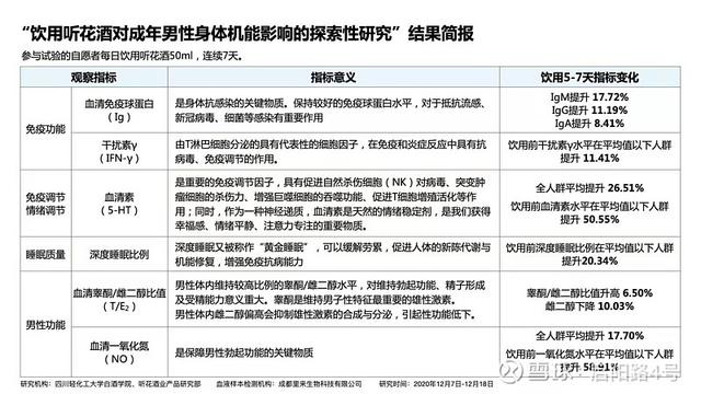 記者從這張網傳的關于“飲用聽花酒對成年男性身體機能影響的探索研究”結果簡報內容中看到,其顯示參與試驗的健康成年男性自愿者,在連續7天、每日飲用聽花酒50ml后,血清免疫球蛋白(Ig)指數、干擾素γ(IFN-γ)以及血清素等指標大幅提升;飲用聽花酒后,受試者中深度睡眠比例在平均值以下人群的理化指標提高了20.34%。另外,實驗簡報中還特別列出了聽花酒對男性功能的影響:飲用者的血清睪酮及血清一氧化氮(保障男性功能的關鍵指標)有顯著提升,其中睪酮/雌二醇比值升高6.50%,雌二醇下降10.03%;一氧化氮水平在平均值以下人群提升58.91%。