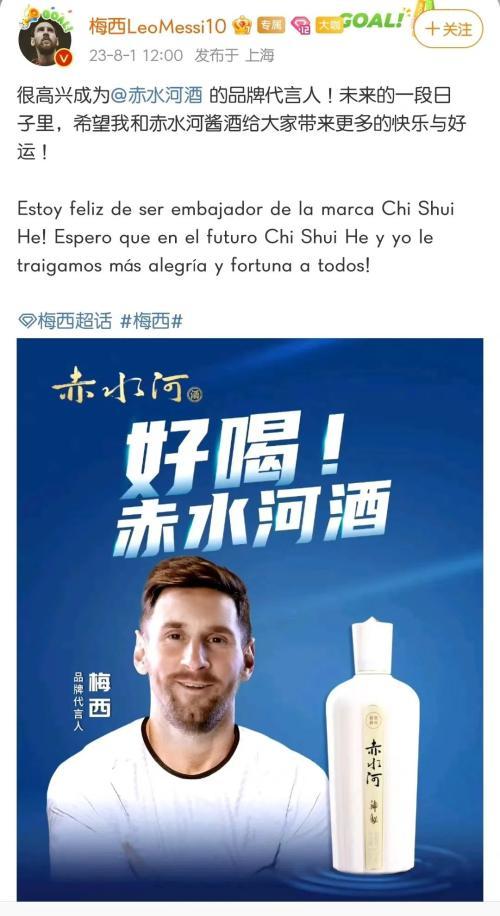 8月1日,“球王”梅西通過個人官方微博宣布了一則代言,稱很高興成為赤水河酒的品牌代言人,未來的一段日子里,希望能和赤水河醬酒給大家帶來更多快樂與好運。