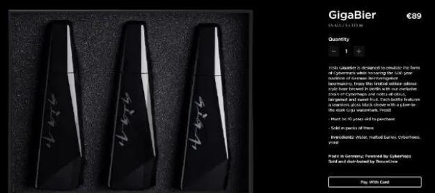 此前,特斯拉在歐洲市場推出一款皮爾斯納風格啤酒 GigaBier ,3 瓶售價 89 歐元,也就是 668 元人民幣,一瓶 200 多塊,官方透露,這款酒 330ml,酒精含量 5%,還是限量版,每個人最多可訂購 3 瓶。