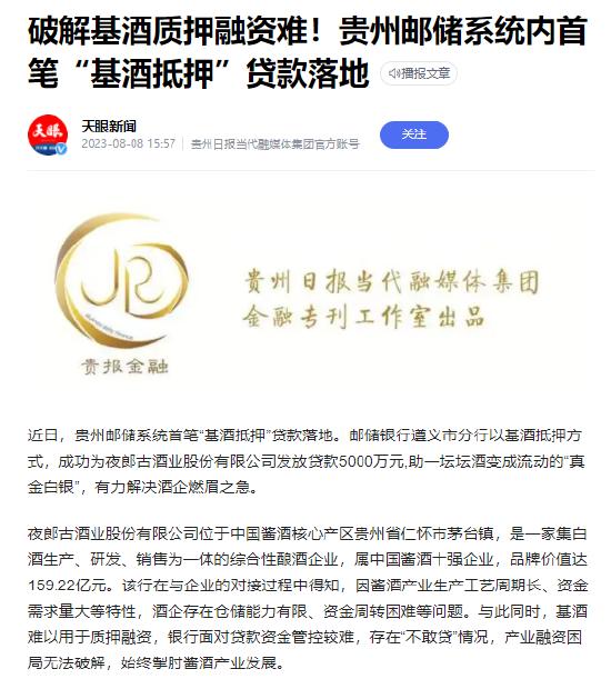 近日,據天眼新聞報道,郵儲銀行遵義市分行以基酒抵押方式成功為夜郎古酒業股份有限公司發放貸款5000萬元,把一壇壇酒變成了流動的真金白銀,真正解決了酒企的燃眉之急。