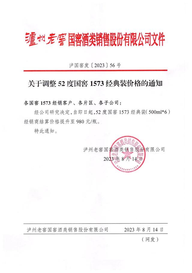 一名四川的瀘州老窖經銷商向紅星資本局表示,已收到文件通知,52度國窖1573經典裝(500ml*6)經銷商結算價格提升至980元/瓶。