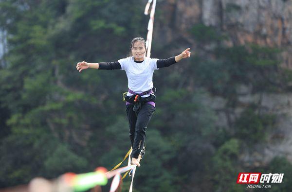 “哇!太刺激,太震撼啦!”當日的比賽扣人心弦,選手在高空峽谷間架起的扁帶上行走,宛如空中曼舞,沿線觀看的游客驚叫不斷。曾獲2022世界錦標賽高空速度男子冠軍法國運動員Benoit (中文名:本)感慨地說:“我參加過世界上很多國家的扁帶賽,但這次是最刺激最有趣的一次,在一片連一片、一根一根的山之間行走,視覺沖擊太強烈,心情特別激動。”