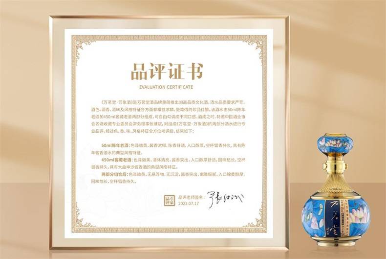 萬茗堂•萬象酒在酒成之時,力邀中國酒業協會名酒收藏專業委員會常務理事、兼職副秘書長、江蘇省收藏家協會酒類收藏專業委員會長、老酒收藏專家張繼斌進行專業勾調和品評,給予:“酒色黃,一看就是經年累月的老酒,醬香很濃郁,芳香力度也很強,聞香之后能感受到15年以上老酒的那種穿透力”高度評價,并為其出具品評證書。