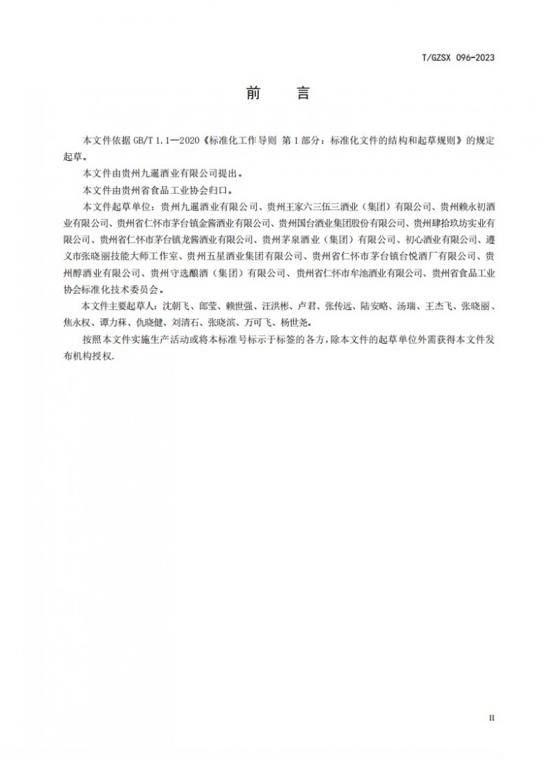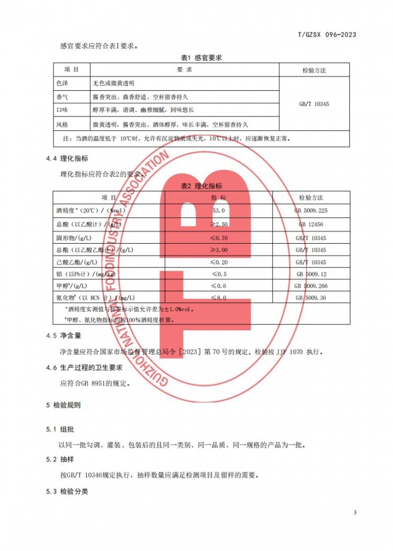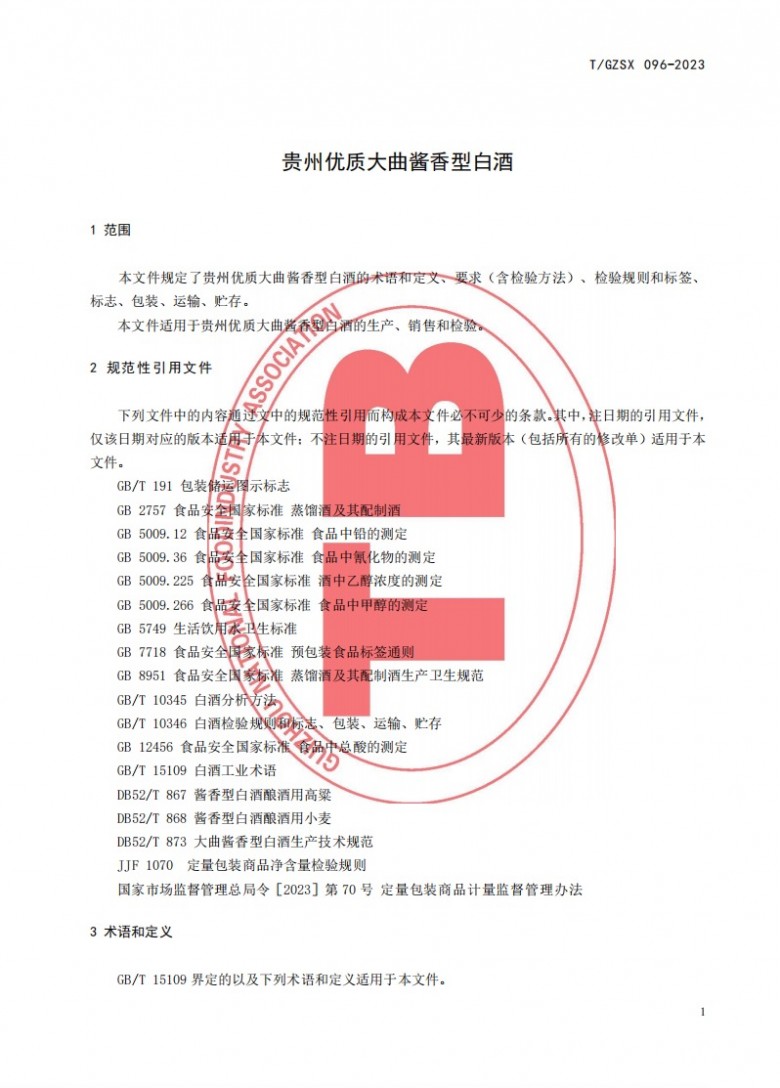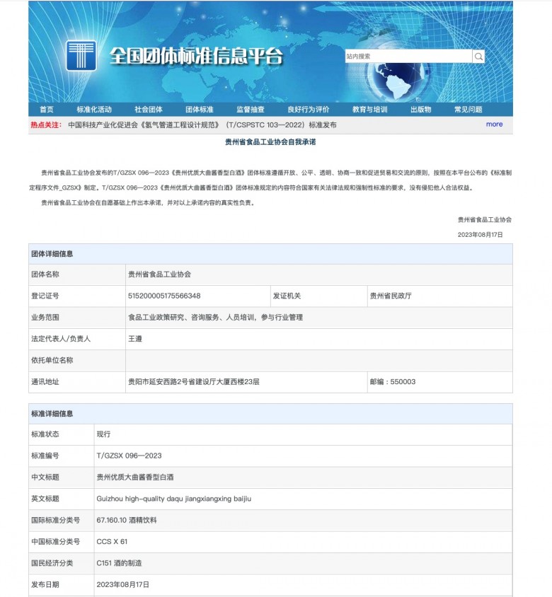 據全國團體標準信息平臺網站顯示,由中國食品工業協會發布的《貴州優質大曲醬香型白酒》全國團體標準(標準編號T/GZSX 096-2023)于2023年8月17日正式發布,2023年9月1日正式實施。