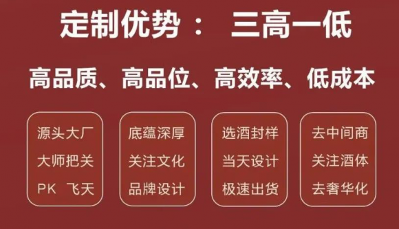 商務(wù)接待采用企業(yè)定制酒,不僅有面子、上檔次,還能體現(xiàn)企業(yè)實(shí)力,提升品牌美譽(yù)度。同時(shí),定制酒用作員工福利,也能增加員工認(rèn)同感和凝聚力。同時(shí)由廠家設(shè)計(jì)師提供一體化設(shè)計(jì),將企業(yè)名稱logo、經(jīng)營理念、企業(yè)文化等個(gè)性元素完美融合在包裝上,定制酒是外延包裝到酒體內(nèi)涵的雙重套餐化定制,匠心獨(dú)具,彰顯尊貴。