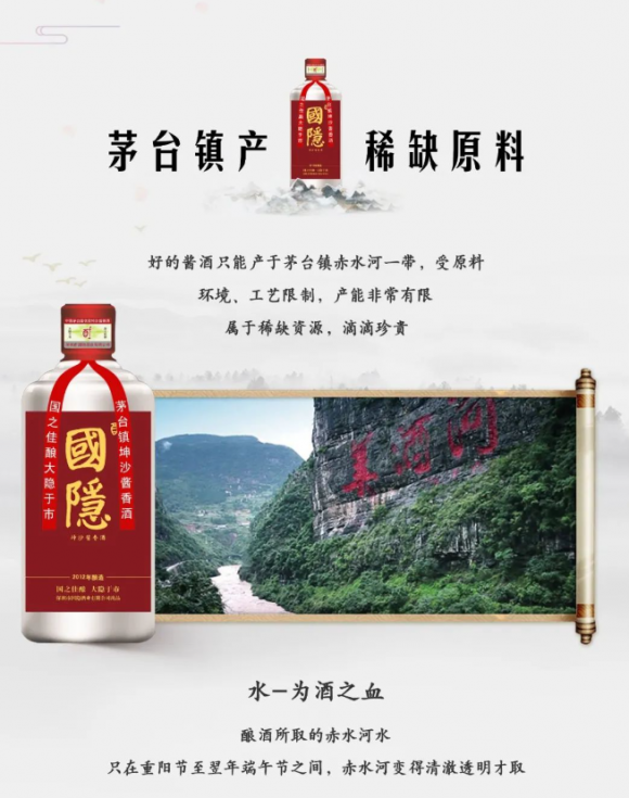 首先,國隱酒廠位于中國醬酒核心產(chǎn)區(qū)茅臺鎮(zhèn),更是位于中國醬酒核心產(chǎn)區(qū)的3.5平方公里內(nèi),保證了酒的原料來自醬酒的發(fā)源地,制作工藝傳承了醬酒的歷史和文化。