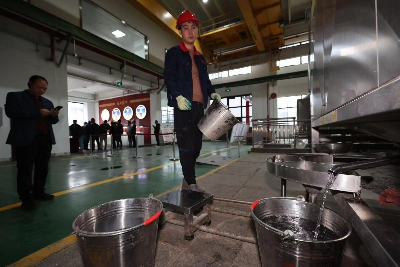 在陜西西鳳酒廠集團有限公司905車間門口貼著一副嶄新的對聯,上聯為“好糧好曲釀成一杯好酒”,下聯是“匠心匠藝鑄就千年匠魂”,在酒廠中這樣的對聯還有很多。傳統印象中似乎只有春節才有這樣的“儀式感”。面對記者疑問,905車間主任,臧會祥說:“現在就是我們釀酒人的‘春節’呀。”