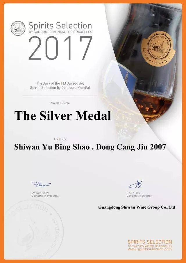 ▲“石灣玉冰燒·洞藏九”榮獲2017比利時(shí)布魯塞爾國(guó)際烈性酒大獎(jiǎng)賽銀獎(jiǎng)榮譽(yù)。
