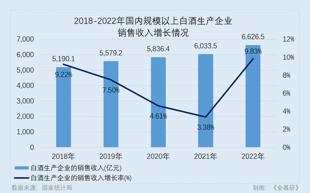 數(shù)據(jù)顯示,2018-2022年,國內(nèi)規(guī)模以上白酒生產(chǎn)企業(yè)的銷售收入分別為5,190.1億元、5,579.2億元、5,836.4億元、6,033.5億元、6,626.5億元,2022年規(guī)模以上白酒生產(chǎn)企業(yè)的銷售收入較同期增長9.83%。