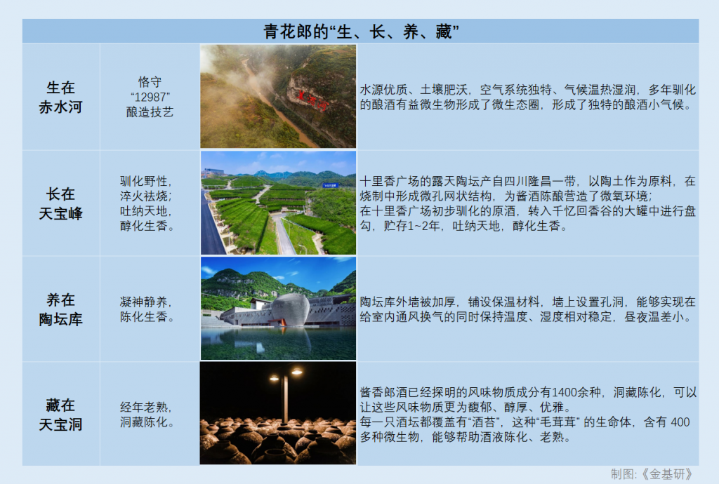 在赤水河邊釀造、在天寶峰上成長、在陶壇庫里靜養(yǎng)、在天寶洞中修煉洞藏,以特級(jí)酒為體,以20年以上陳年酒及調(diào)味酒為魂,青花郎醬香突出、幽雅細(xì)膩、酒體醇厚,具有行業(yè)最好的回味。