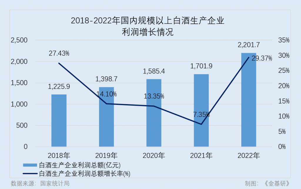 從利潤的角度看,2018-2021年,國內(nèi)規(guī)模以上白酒生產(chǎn)企業(yè)的利潤分別為1,225.9億元、1,398.7億元、1,585.4億元、1,701.9億元、2,201.7億元,2022年規(guī)模以上白酒生產(chǎn)企業(yè)的利潤較2021年增長29.37%。