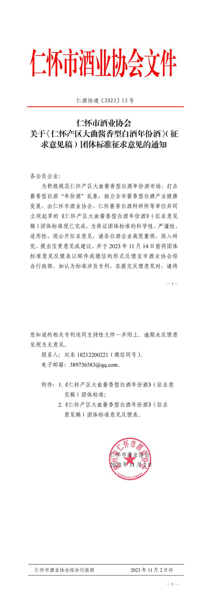 11月2日,貴州省仁懷市酒業(yè)協(xié)會發(fā)布關(guān)于《仁懷產(chǎn)區(qū)大曲醬香型白酒年份酒》(征求意見稿)團體標準征求意見的通知。通知指出,為積極規(guī)范仁懷產(chǎn)區(qū)大曲醬香型白酒年份酒市場,打擊醬香