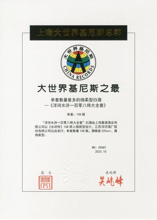 據洋河官方消息,洋河從《水滸傳》中汲取靈感,出品生產了洋河水滸一百零八將大全套系列產品,并在近日以單套數量最多的綿柔型白酒榮獲大世界基尼斯之最。 洋河表示,上海大世界基尼