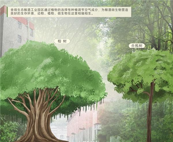 在射洪優越的大生態基礎上,舍得生態釀酒工業園區內有目的、有選擇、有規劃地模擬自然生態系統,種植了各類喬木、灌木、花草上百種,包括楠木、香樟、銀杏等名貴林木。