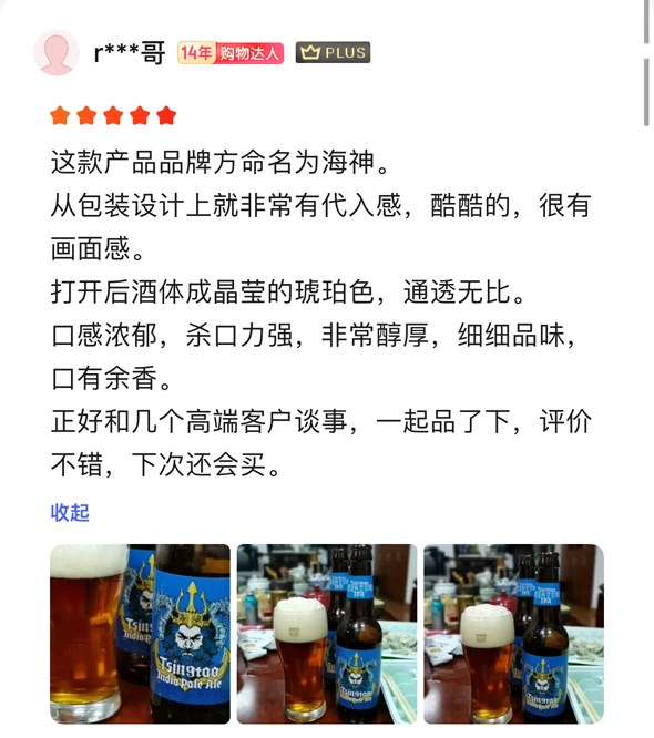 “打開后酒體成晶瑩的琥珀色,通透無比。口感濃郁,殺口力強,非常醇厚,細細品味,口有余香。正好和幾個高端客戶談事,一起品了下,評價不錯,下次還會買。” “不僅口感,包裝設計上也非常有代入感,酷酷的,還有大航海時代的神秘感。”“口感醇厚、麥芽濃、品質高、價格:值!!!”在剛剛過去的雙十一,收到青島啤酒IPA的消費者紛紛打出五星好評。