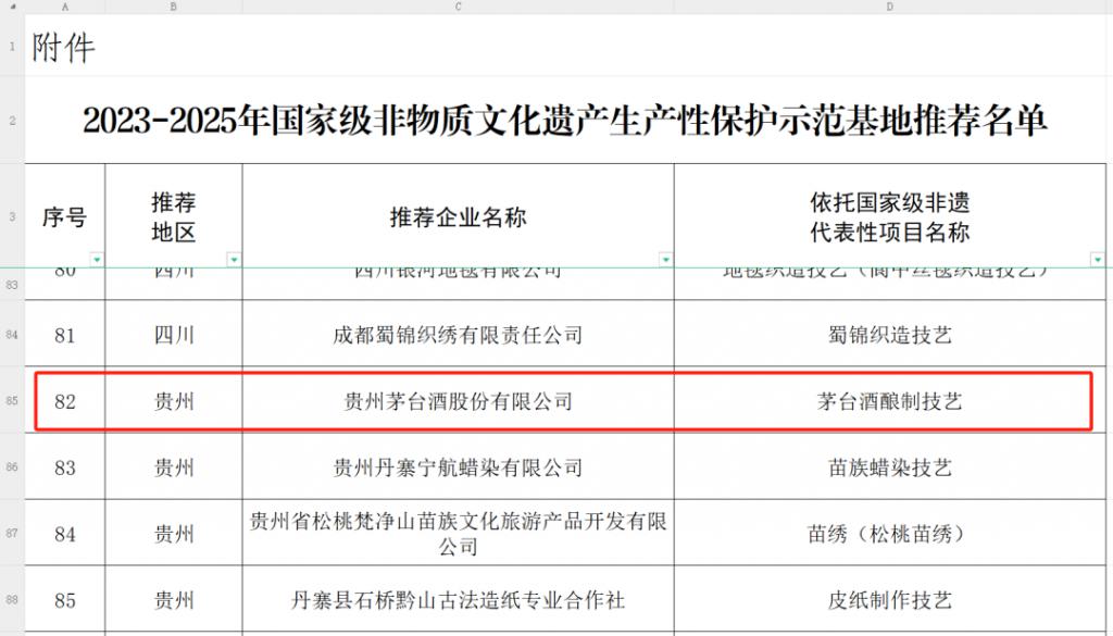 11 月 27 日,中華人民共和國文化和旅游部公示 2023-2025 年國家級非物質文化遺產生產性保護示范基地推薦名單,貴州茅臺酒股份有限公司以茅臺酒釀制技藝入選。 此前的 11 月 1 日,國家文化和
