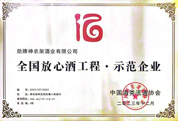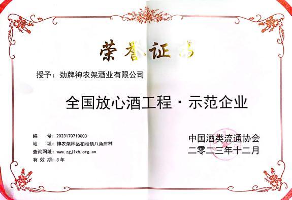 2023年12月13日,在江西南昌召開的“2023年全國放心酒工作會議”上,勁牌神農架酒業有限公司憑借卓越的產品質量、嚴格的企業管理和品質管控榮獲“全國放心酒工程示范企業”榮譽稱號。