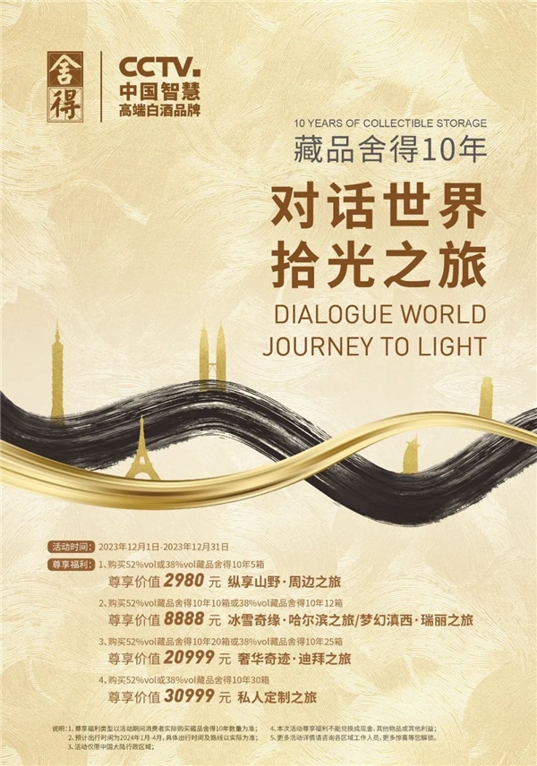 同時,舍得酒還打造了重點產品專項活動——藏品舍得10年“對話世界·拾光之旅”,針對購買高端的藏品舍得10年52度或38度的消費者或單位,推出旅游獎勵,最高可獲得價值30999元的私人定制游,打造深度的消費者體驗。