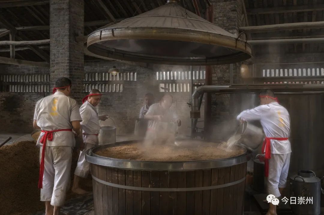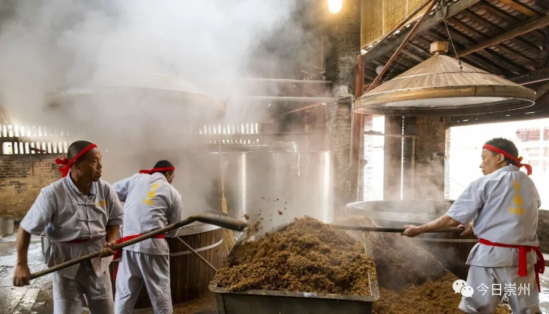 工人們翻料、蒸煮,忙著釀酒