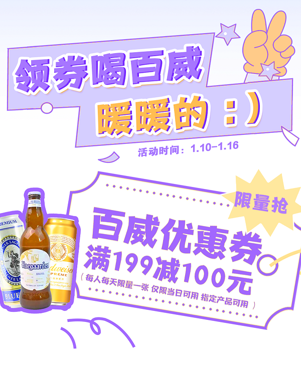 當參與飯局出現尷尬與冷場時,一杯美酒或許是解圍之道。滴滴酒液入喉,溫暖了身心,也舒緩了情緒,幫助人們更好地發生互動和建立聯系,將無聊和壓力變成了有趣和輕松,聚會也因為好酒的存在而變得更加難忘。自1月10日起至1月16日,永輝生活-詠悅匯酒庫將限量發放百威品牌滿199減100元優惠券(每人每天限量一張 僅限當日可用 指定產品可用 ),有福佳白啤酒330ml、科羅娜特級330ml、百威金尊聽裝500ml等產品參與活動,領券喝百威,樂享每一次飯局。