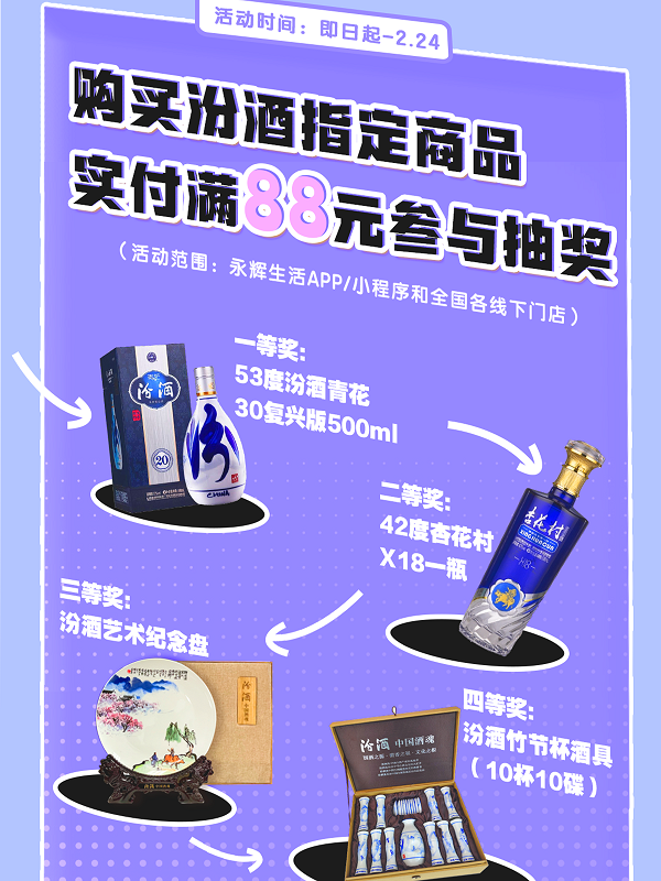 抽獎一波未完還有一波,同時間段,在永輝生活APP/小程序及全國各線下門店購買汾酒指定商品實付滿88元可參加抽獎,獎品包含53度汾酒青花30復興版500ml、42度杏花村X18一瓶、汾酒藝術紀念盤等,典雅飄香,回味悠長。