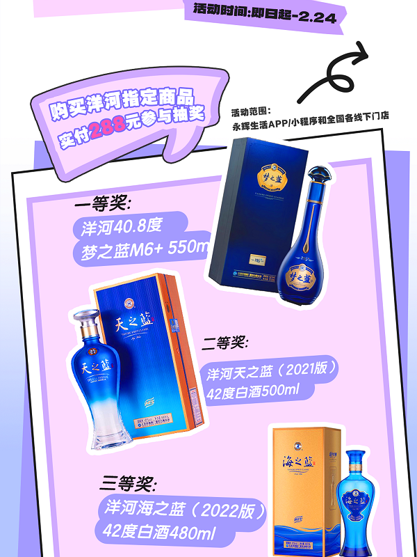 燭光隨著微風的擺動而搖曳,音樂低回之間,美酒仿佛化身為愛情的使者,它在口腔中流動,點燃兩顆心之間微妙的火花,將暖意與愛意傳遞至互有好感的兩個人的身體與心靈。好酒一開,曖昧升溫。茫茫人海中邂逅的概率如同中獎般的概率,愛意成雙的幸運也如同中獎般的幸運,因此,永輝生活-詠悅匯酒庫對應推出幸運抽獎活動,即日起至2月24日,在永輝生活APP/小程序及全國各線下門店購買洋河指定商品實付滿288元可參加抽獎,獎品包含洋河40.8度夢之藍M6+ 550ml、洋河天之藍(2021版)42度白酒500ml、洋河海之藍(2022版)42度白酒480ml等,柔而不寡,綿長而尾凈。