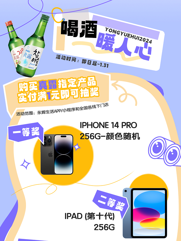 職場中一帆風順并不常見,往往既有得意,也有失意。得意可舉杯歡慶,失意亦可對飲消愁。好酒一開,無論得意還是失意,同是打工人,一同抱團取暖,分享喜憂,相互鼓勵和支持,在友好和融洽的工作環境中并肩前行。即日起至1月31日,在永輝生活APP/小程序及全國各線下門店購買真露指定產品實付滿1元即可抽獎,獎品包含iPhone 14 Pro 256G-顏色隨機、iPad (第十代)256G、AirPods (第三代)等,一起喝真露,飽滿果香,順滑口感,微醺體驗暖心職場。