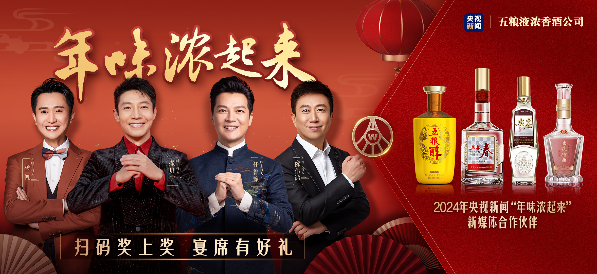 近日,2024央視新聞“年味濃起來”新媒體合作伙伴——五糧液濃香酒公司正式揭開“年味主持人”的神秘面紗,撒貝寧、任魯豫、楊帆、陳偉鴻分別闡釋五糧春、尖莊、五糧醇、五糧特曲的品牌精神,讓年味“濃上加濃”。