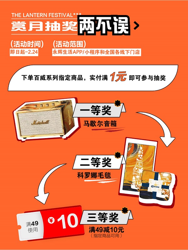月上柳梢頭,彼此屬意的一對對良人相約黃昏后一同賞月暢談,播放喜愛的音樂,配上沁人心脾的啤酒,歡享良辰美景,分外美好。月圓向吉,花開向喜,即日起至2月24日,在永輝生活APP/小程序和全國各線下門店下單百威系列指定商品實付滿1元即可參與抽獎,獎品包含馬歇爾音箱、科羅娜毛毯、滿49減10元優(yōu)惠券等,好酒一開吉運到,喜氣洋洋過元宵。