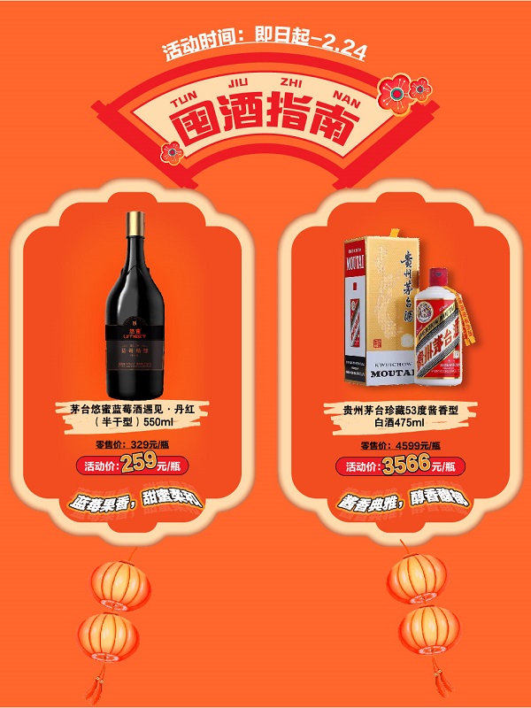 良辰美景歲歲擁,美酒珍饈時時有。每逢瑞年樂事,少不了家人圍坐,舉杯歡慶,共享盛宴的團聚時刻。為這一場時歲團圓宴,即日起至2月24日,永輝生活-詠悅匯酒庫推出好酒優(yōu)惠活動,茅臺悠蜜藍莓酒遇見·丹紅(半干型)550ml活動價259元/瓶(零售價329元/瓶),藍莓果香,甜蜜柔和,貴州茅臺珍藏53度醬香型白酒475ml活動價3566元/瓶(零售價4599元/瓶),醬香典雅,醇香馥郁,優(yōu)價囤好酒,逢節(jié)飲酒更暢快。此外,永輝生活-詠悅匯酒庫還將發(fā)布好酒上新活動,中菲干杯干紅葡萄酒750ml,酒中散發(fā)著濃郁的香氣,口感柔滑,中菲盡歡西拉干紅葡萄酒750ml,帶有黑色水果香氣,口感濃烈。