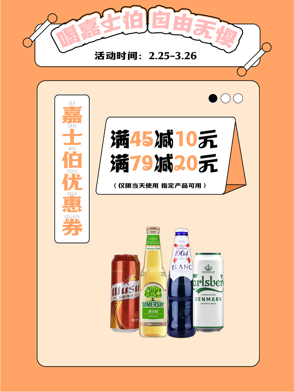 職場發展道阻且長,自2月25日至3月26日,永輝生活-詠悅匯酒庫推出嘉士伯品牌優惠券助力消費者自在追光,包括滿45減10元、滿79減20元兩種券(僅限當天可用 指定產品可用),有嘉士伯啤酒罐裝500ml、1664白啤小瓶330ml、烏蘇啤酒500ml等產品參與活動,喝嘉士伯,醇香四溢,自由無懼,盡展風采。