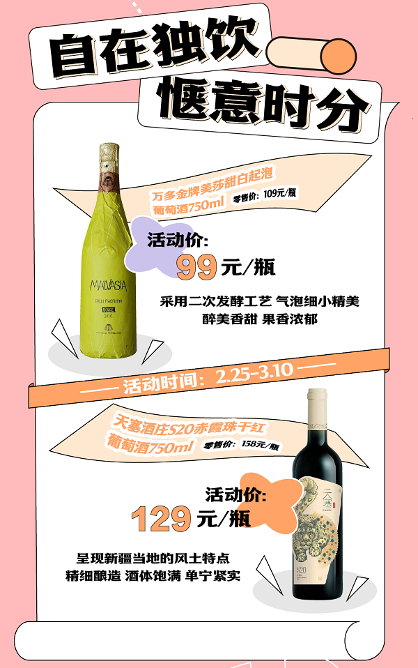此外,自2月25日至3月10日,永輝生活-詠悅匯酒庫推出葡萄酒價格優惠活動,萬多金牌美莎甜白起泡葡萄酒750ml活動價99元/瓶(零售價109元/瓶),采用二次發酵工藝,氣泡細小精美,醉美香甜,果香濃郁,天塞酒莊S20赤霞珠干紅葡萄酒750ml活動價129元/瓶(零售價158元/瓶),呈現新疆當地的風土特點,精細釀造,酒體飽滿,單寧緊實。