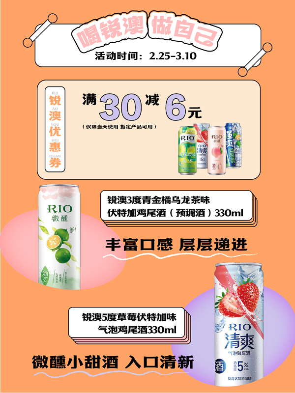 網絡與現實中對女性胖瘦的議論不在少數,部分的議論將纖瘦的身材作為美的衡量尺度,但瘦并非美的全部,女性自己的身體,也并非是他人的景觀。千面千美,美麗沒有標準答案,悅納自己,獨立而自信才是美的恰當詮釋。因此,自2月25日至3月10日,永輝生活-詠悅匯酒庫推出銳澳品牌滿30減6元優惠券(僅限當天使用 指定產品可用),有銳澳微醺六聯包雞尾酒330ml*6、銳澳白桃白蘭地味雞尾酒(預調酒)330ml、銳澳檸檬朗姆味雞尾酒(預調酒)330ml等產品參與活動,銳澳悅己時刻,做真實的自己。