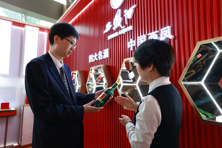 圖為陜西西鳳酒股份有限公司總經理張周虎參觀產品展臺