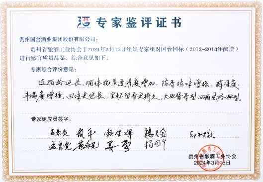其中,國臺國標酒(2019年釀造)意見為:微黃透明、醬香突出、陳香舒適、老酒味明顯。醇厚豐滿、圓潤協(xié)調(diào)、回味悠長,空杯留香持久,大曲醬香型向酒風格典型。
