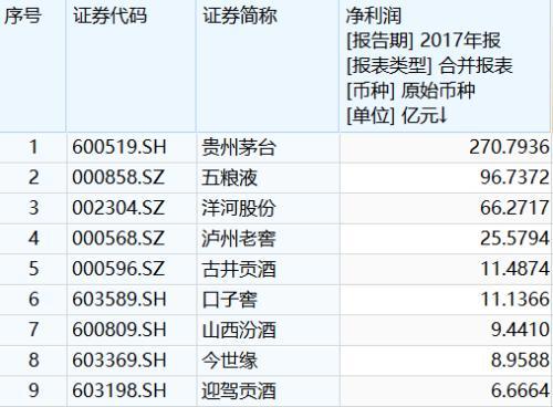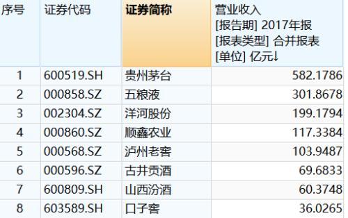 以公司2017年的營收對比,Wind數據顯示,A股白酒上市公司中,貴州茅臺、五糧液、洋河股份、順鑫農業、瀘州老窖、古井貢酒、山西汾酒和口子窖共8家企業都已超過31.70億元。凈利潤方面,有9家公司超過了西鳳酒。