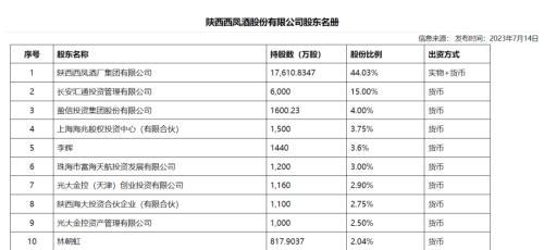 本次增資擴股前,西鳳酒的注冊資本為4億元,前三大股東分別為陜西西鳳酒廠集團(44.03%)、長安匯通(15%)、盈信投資集團(4%)。