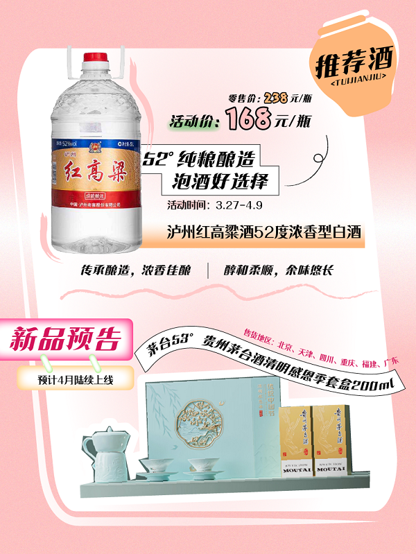 為實現青梅泡酒恰合心意,永輝生活-詠悅匯酒庫傾情推薦泡酒好選擇瀘州紅高粱酒52度濃香型白酒,52°純糧釀造,醇和柔順,余味悠長,自3月27日至4月9日,瀘州紅高粱酒52度濃香型白酒5L活動價168元/瓶(零售價238元/瓶),四月不僅是泡酒的好時節,也是踏青的好時節,清明將至,永輝生活-詠悅匯酒庫推出新品上市活動,茅臺53°貴州茅臺酒清明感恩季套盒200ml(售貨地區:北京、天津、四川、重慶、福建、廣東),情如潺潺,心似盈盈,一壺二杯,攜酒祭祖郊游,感受濃濃春意。