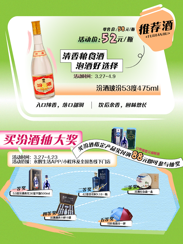 梅子時節,永輝生活-詠悅匯酒庫傾情推薦泡酒好選擇汾酒佳釀,推出汾酒品牌實惠活動,自3月27日至4月9日,汾酒玻汾53度475ml活動價52元/瓶(零售價58元/瓶),清香糧食酒,入口綿香,落口甜潤。自3月27日至4月23日,在永輝生活APP/小程序及全國各線下門店購買汾酒指定商品實付滿88元還可參加抽獎(訂單需要核銷),獎品包含53度汾酒青花30復興版500ml、42度杏花村X18一瓶、汾酒紀念盤等,購汾酒,享好禮,有竹葉青38度酒500ml、汾酒53度青花(20)500ml、汾酒53度青花30復興版白酒500ml等產品參與活動,典雅飄香,回味悠長。
