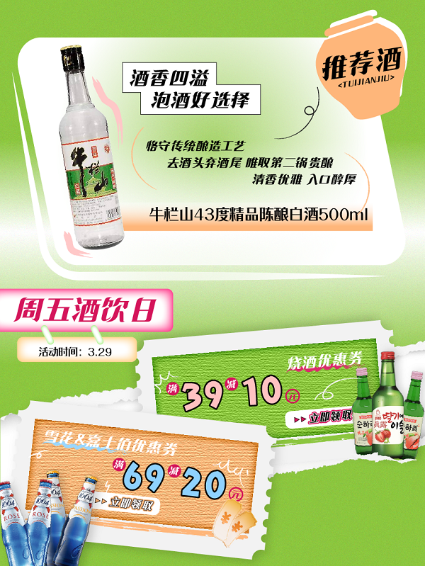 而為了讓廣大用戶能夠釀造出甜美桃子酒,永輝生活-詠悅匯酒庫傾情推薦泡酒好選擇牛欄山43度精品陳釀白酒500ml,去酒頭棄酒尾,唯取第二鍋貴釀,清香優雅,酒香四溢。泡酒是一門等待的學問,心急的酒友不妨先在周五酒飲日暢快開喝,過過酒癮,3月29日,永輝生活-詠悅匯酒庫會發放雪花品牌與嘉士伯品牌滿69減20元優惠券,有1664桃紅啤酒330ml、1664百香果風味啤酒330ml、夏日紛芒果味酒330ml等產品參與活動,另外,永輝生活-詠悅匯酒庫還將發放滿39減10元燒酒優惠券,有初飲初樂桃子味配制酒360ml、真露桃子味利口酒360mL、真露草莓味利口酒360ml等產品參與活動