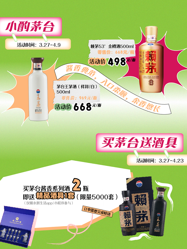 同時,永輝生活-詠悅匯酒庫推出茅臺價格優惠活動,茅臺王茅酒(祥邦/白)500ml活動價668元/瓶(零售價969元/瓶),醬香清雅,酒體豐滿,回味無窮,賴茅53°金樽酒500ml活動價498元/瓶(零售價668元/瓶),醬香典范,入口柔順,余香悠長。自3月27日至4月23日,在永輝生活APP/小程序下單茅臺醬香系列酒滿2瓶即送1套精品酒具(限量5000套,訂單需要核銷),參與活動的產品有茅臺王茅酒(祥雅/黑)500ml、茅臺華茅酒(藍)500ml、賴茅(傳承)53度500ml,好酒配好具,飲酒更有韻味。