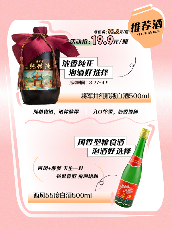 三兩嫣紅桃花釀,醉飲人間春一場。陽春三月,制作一杯桃花釀恰恰能收獲應季微醺的美好,輕抿一口,醇香而芬芳。首先用淡鹽水浸泡清洗去根蒂的新鮮桃花花瓣250g,并晾干水分,再鋪一層白砂糖在干凈的玻璃瓶底,將桃花、白芷粉20g、白酒2500g倒入瓶子里密封保存,等待一個月后即可飲用。桃花釀酒,不負春光,永輝生活-詠悅匯酒庫傾情推薦泡酒好選擇將軍井純糧液窖齡30白酒52度500ml,純糧食酒,入口綿柔,濃香純正,自3月27日至4月9日,將軍井純糧液白酒500ml活動價19.9元(零售價33.8元/瓶)。