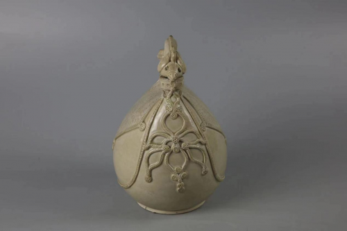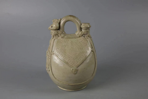 但真正令人驚嘆于唐代白瓷工藝的高超水平,沉醉于唐代白瓷雍容、飽滿、華貴和恢宏氣度的皮囊壺文物,當屬1996年衡水故城縣出土的唐邢窯白釉鳳首蓋貼花皮囊壺。扁圓的壺身,由三張仿皮頁陶瓷“縫合”而成,“針腳”規整細密可見;壺身兩側各搭一張五邊形鞍韉花毯式裝飾,戳印著圓形、條形、麥穗形等花樣裝飾。如果不仔細看,竟會讓人忘了這是一件硬邦邦的瓷器。而這件反映了北方游牧民族與漢文化彼此交融的制品,被衡水博物館評為“館藏一級文物”,成為同類藏品中不可多得的佳作。