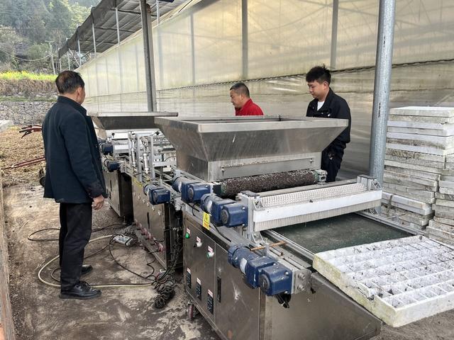 一大早,走進大壩鎮簸箕壩村大型智能化育苗大棚外,穴盤育苗播種機正在快速運作,工人們圍在穴播機旁忙碌著,放盤、加高粱種、覆平機質肥,僅用30秒,就完成了一盤高粱的育苗工作。“機器育苗一個小時,一個人工一天都做不完,自從機械化育苗過后,節省了不少的人工。”仁懷市大壩鎮簸箕壩村村民劉玉剛說。