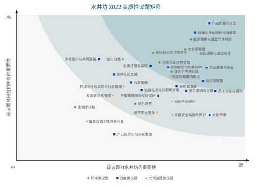 水井坊2022年ESG報告顯示,“產品質量與安全”、“健康生活與理性飲酒倡導”、“能源使用與溫室氣體排放”、“水資源管理”、“商業道德與誠信經營”、“原材料采購可持續性”、“職業健康與安全”等12項議題被列入高實質性議題。