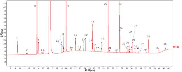 2021年,國臺采用氣相色譜法,對國臺國標酒的35種成分進行分離和檢測,得到國臺國標酒的氣相指紋圖譜。國臺連續(xù)三年,選擇多批次感官品評無差異的國臺國標酒樣品,作為構建國臺國標酒指紋圖譜的標準樣品集。再將這些標準樣品的圖譜進行共有化處理,得到國臺國標酒的共有模式,即代表國臺國標酒的標準圖譜,也是對照指紋圖譜。以此標準圖譜為對照,對其他國臺國標酒樣品進行相似度計算,可評價其他國臺國標酒與標準國臺國標酒圖譜之間的差異。