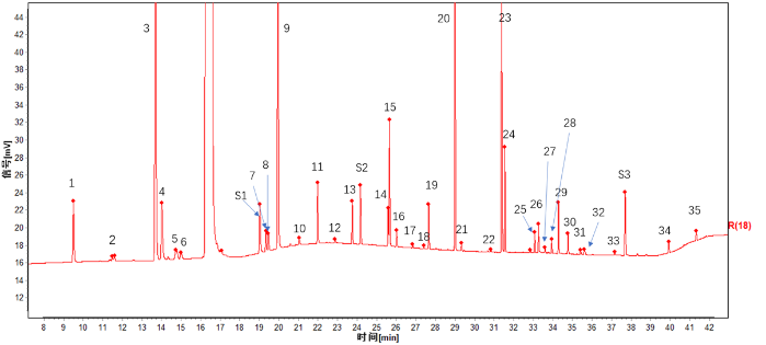 國臺選擇多批次感官品評無差異的國臺國標(biāo)酒樣品,作為構(gòu)建國臺國標(biāo)酒指紋圖譜的標(biāo)準(zhǔn)樣品集。再將這些標(biāo)準(zhǔn)樣品的圖譜進(jìn)行共有化處理,得到國臺國標(biāo)酒的共有模式,即代表國臺國標(biāo)酒的標(biāo)準(zhǔn)圖譜,也是對照指紋圖譜。以此標(biāo)準(zhǔn)圖譜為對照,對其他國臺國標(biāo)酒樣品進(jìn)行相似度對比,可評價(jià)不同批次國臺國標(biāo)酒與標(biāo)準(zhǔn)國臺國標(biāo)酒圖譜之間的差異。
