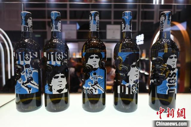 圖為以阿根廷傳奇足球球星馬拉多納形象設計的美酒。中新網記者 李志華 攝